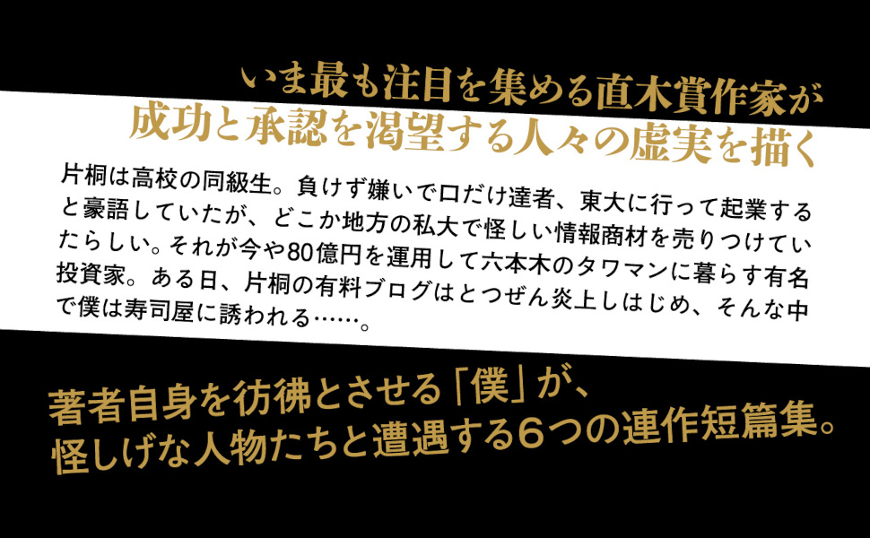 認められたくて、必死だったあいつを、お前は笑えるの? 青山の占い師、80億円を動かすトレーダー、ロレックス・デイトナを巻く漫画家……。著者自身を彷彿とさせる「僕」が、怪しげな人物たちと遭遇する連作短篇集。彼らはどこまで嘘をついているのか? いや、噓を物語にする「僕」は、彼らと一体何が違うというのか? いま注目を集める直木賞作家が、成功と承認を渇望する人々の虚実を描く話題作!