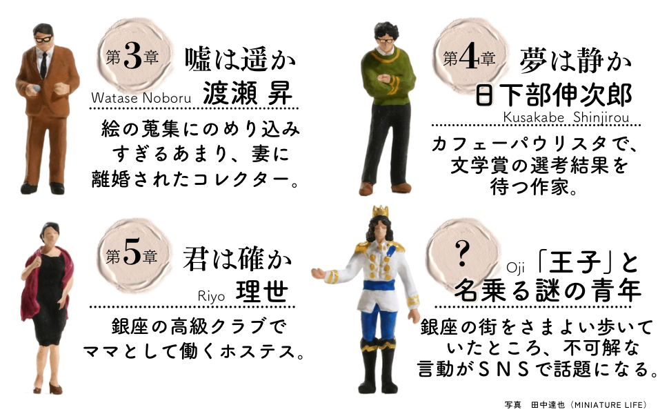 そしてその「人魚騒動」の裏では、5人の男女が「人生の節目」を迎えていた。12歳年上の女性と交際中の元タレントの会社員、娘と買い物中の主婦、絵の蒐集にのめり込みすぎるあまり妻に離婚されたコレクター、文学賞の選考結果を待つ作家、高級クラブでママとして働くホステス。
